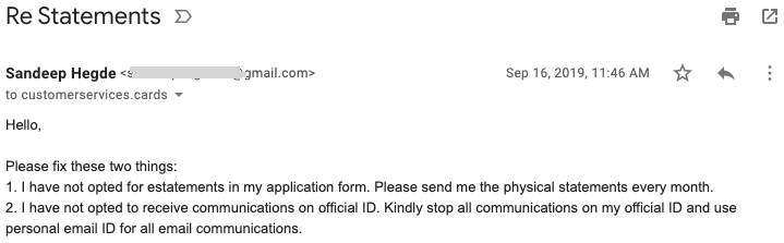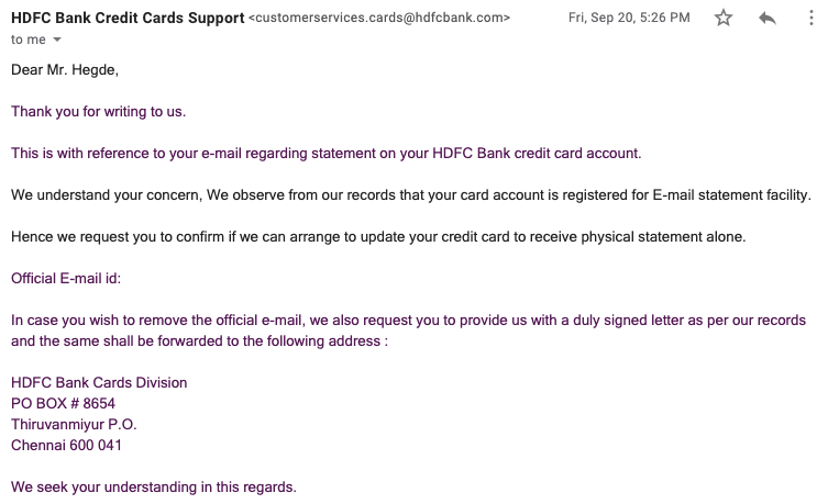A month later I learnt that I had not received physical statement of the credit card from HDFC Bank. I always write emails and never call for customer service. It saves me time and also acts as documented evidence. I wrote a complaint email to HDFC Bank customer care on 16.09.2019